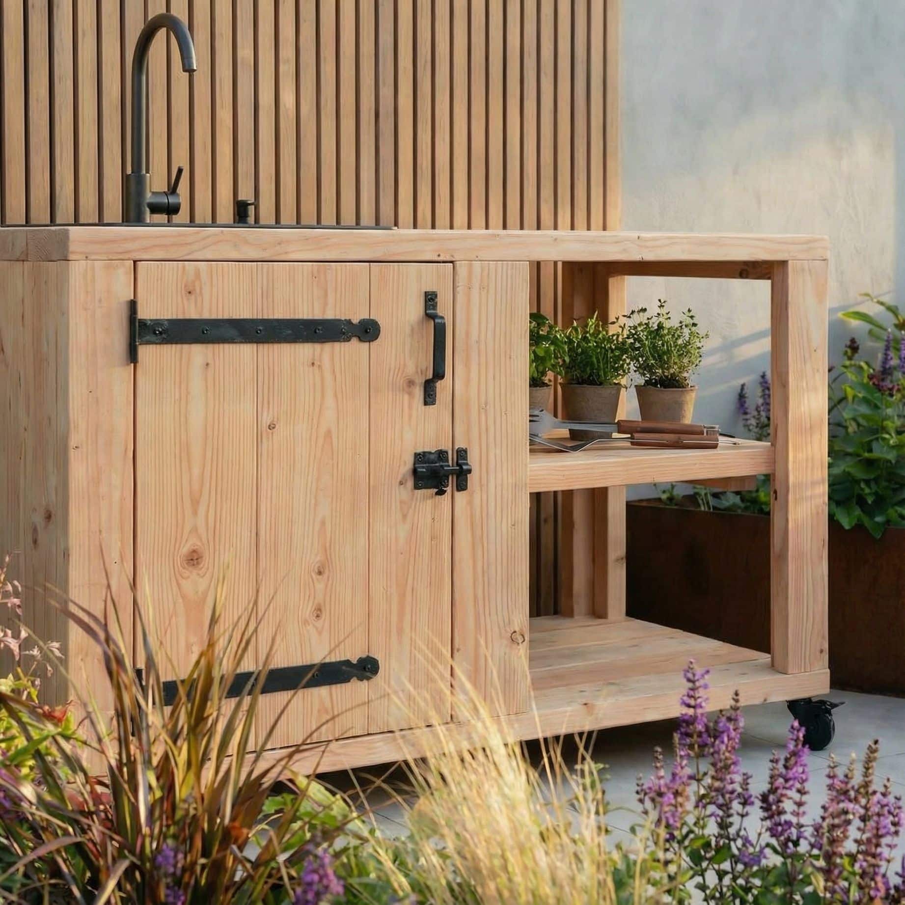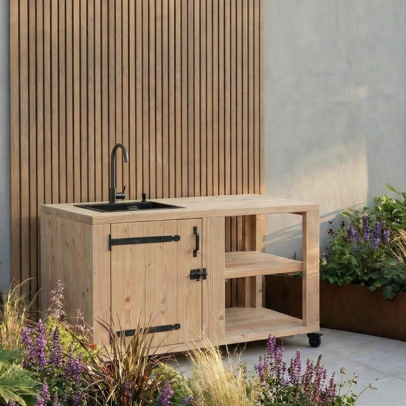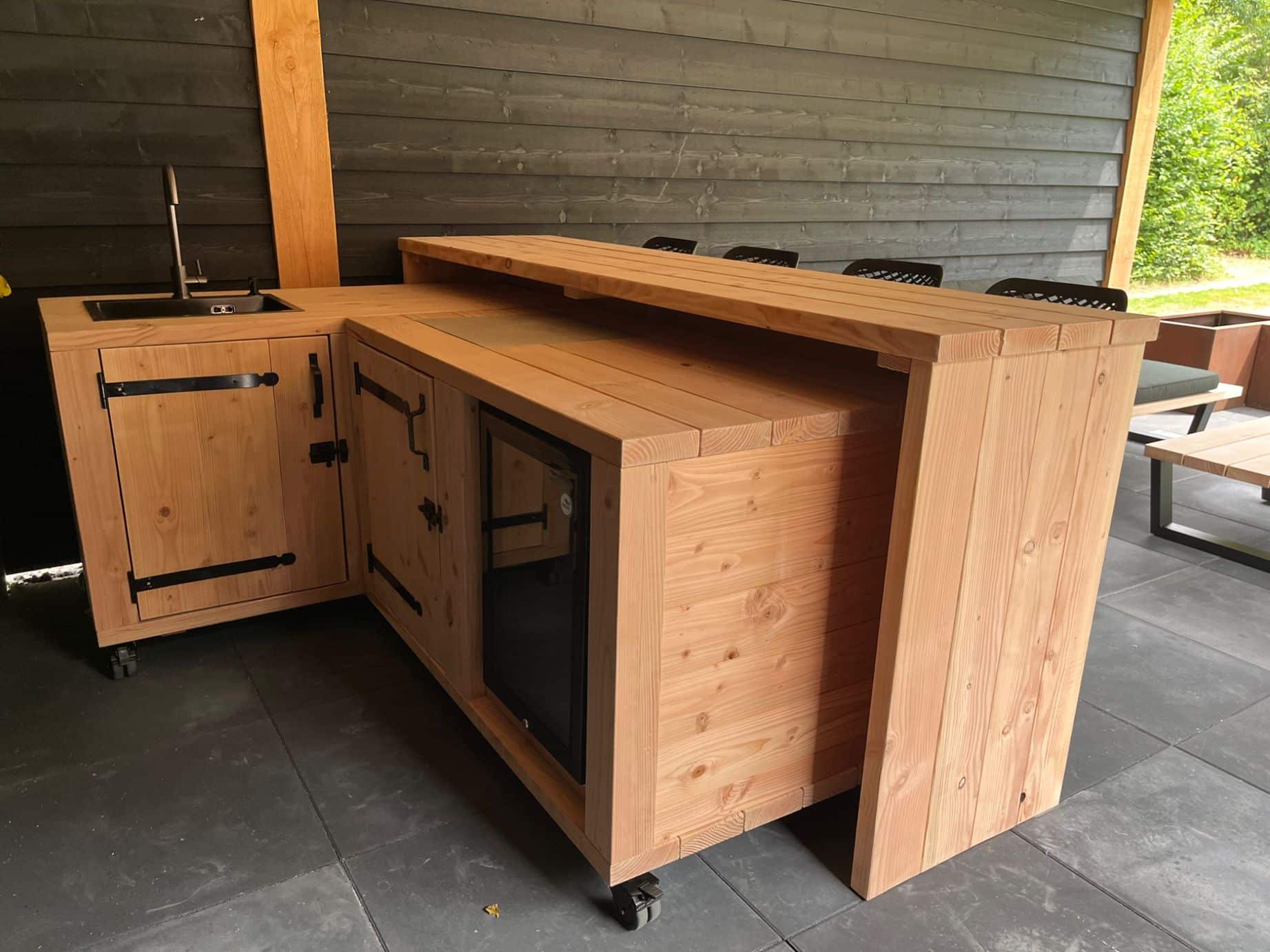 De Buitenkeuken Detroit opstelling is een compacte module voor de Buitenkeuken. Creëer meer werkplek, opbergruimte en maak gebruik van de spoelbak om buiten koken compleet te maken. Met de spoelbak heb je een belangrijke voorziening om buiten te kunnen koken. Door eigen ontwerp en productie kunnen wij deze buitenkeuken leveren als vaste opstelling of volledig maatwerk. Interesse in een Maatwerk buitenkeuken? Vraag vrijblijvend een offerte aan of bezoek onze showroom in Hoogeveen.