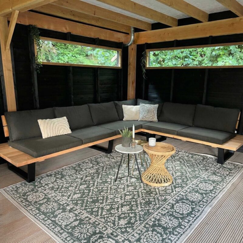 Op zoek naar een comfortabele en stijlvolle loungeset voor uw tuin 6 personen? Dan is Loungeset Jade Large van Douglas hout de perfecte keuze. Deze hoekbank heeft een lengte van 315 cm en een breedte van 240cm. De zitdiepte is 73cm. De hoogte van de set is 35 cm, met een zithoogte van 43 cm. De zitting is gemaakt van 4,5 cm dik douglas hout. Je kiest zelf jouw favoriete kleur kussens en eventueel extra bijzetruimte.