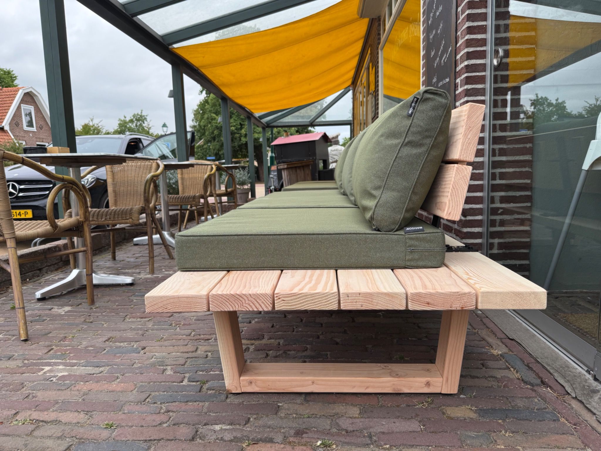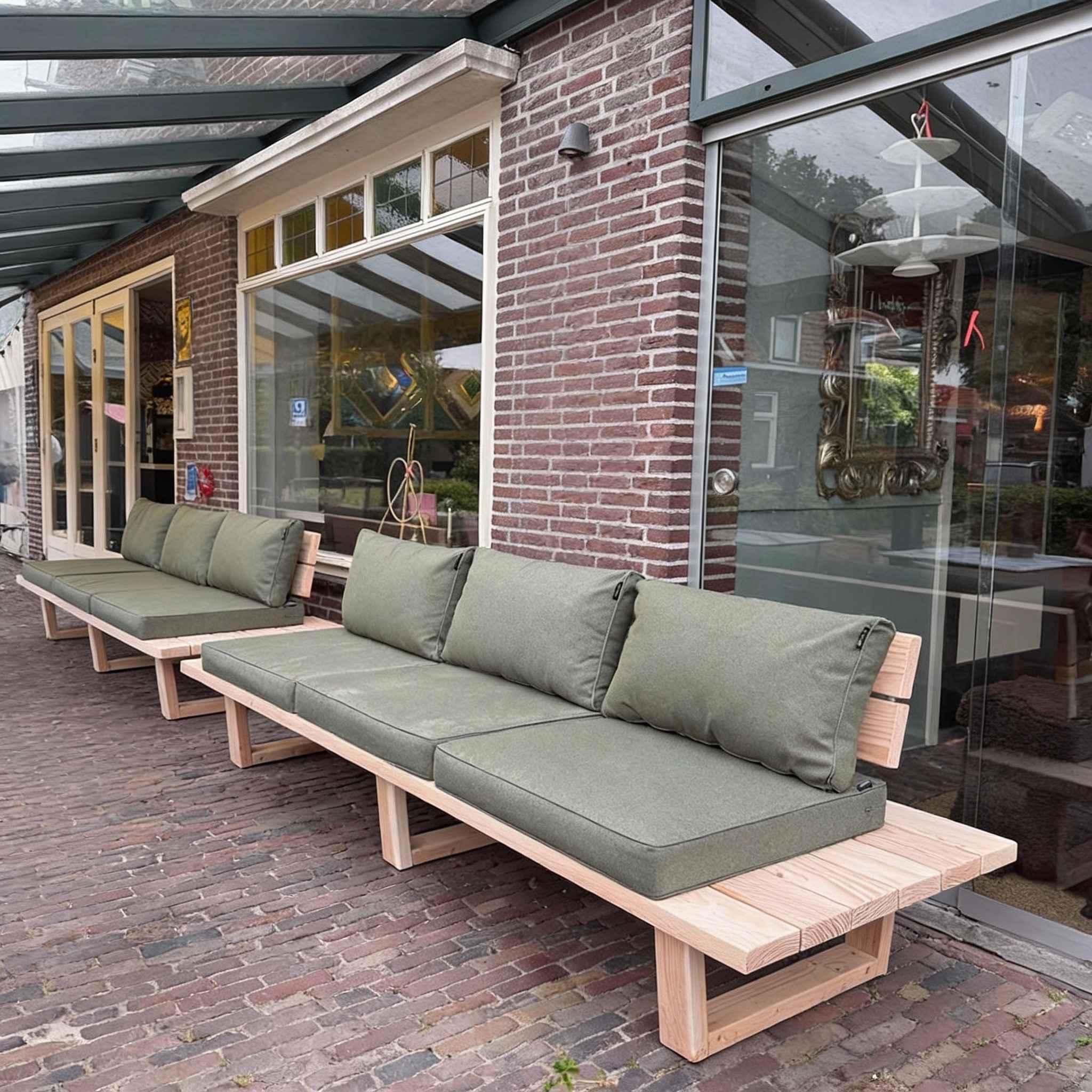Loungebank Jade wordt in onze eigen werkplaats geproduceerd van Douglas hout en gecombineerd met een gepoedercoat stalen onderstel. Deze combinatie van warm hout en strak staal zorgt voor een moderne, tijdloze uitstraling. Het stalen frame geeft de loungeset een solide basis en laat het hout visueel ‘zweven’, wat zorgt voor een luchtig en eigentijds ontwerp.