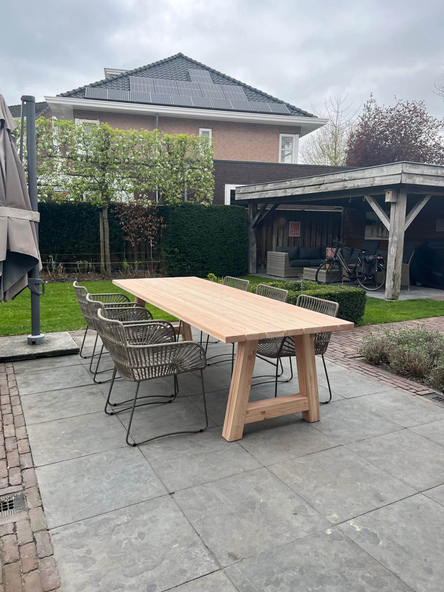Bij een Tuinset van 240cm passen per lange kant van de tafel 3 Senna stoelen tussen de poten. Naar wens kunnen er nog altijd mensen aan de kop van de tafel zitten. Benieuwd naar onze andere modellen? Bekijk dan onze collectie tuinset 6 personen.