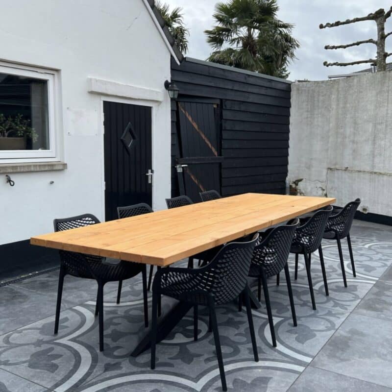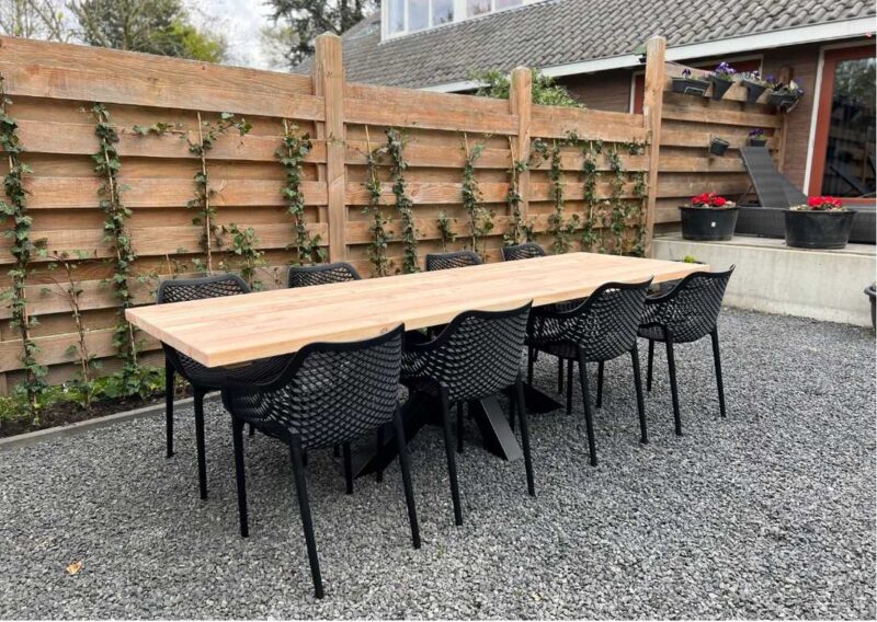 Ga voor deze stevige en comfortabele Tuinset als je vaak vele mensen over de vloer hebt! Deze combinatie is een mooie aanwinst voor jouw tuin. De houten of stalen poten geven de tafel een robuuste uitstraling, kies dus voor jouw gewenste look. Met de 8 zwarte Senna stoelen kan je heerlijk comfortabel zitten, zelfs zonder kussentje! Wil je het blad in een bepaalde kleur hebben, kies dan voor een behandeling of doe het gemakkelijk zelf. Onbehandeld gaan de tafels 10-15 jaar mee. Alleen jaarlijks schoonmaken is voldoende, echt duurzaam dus!