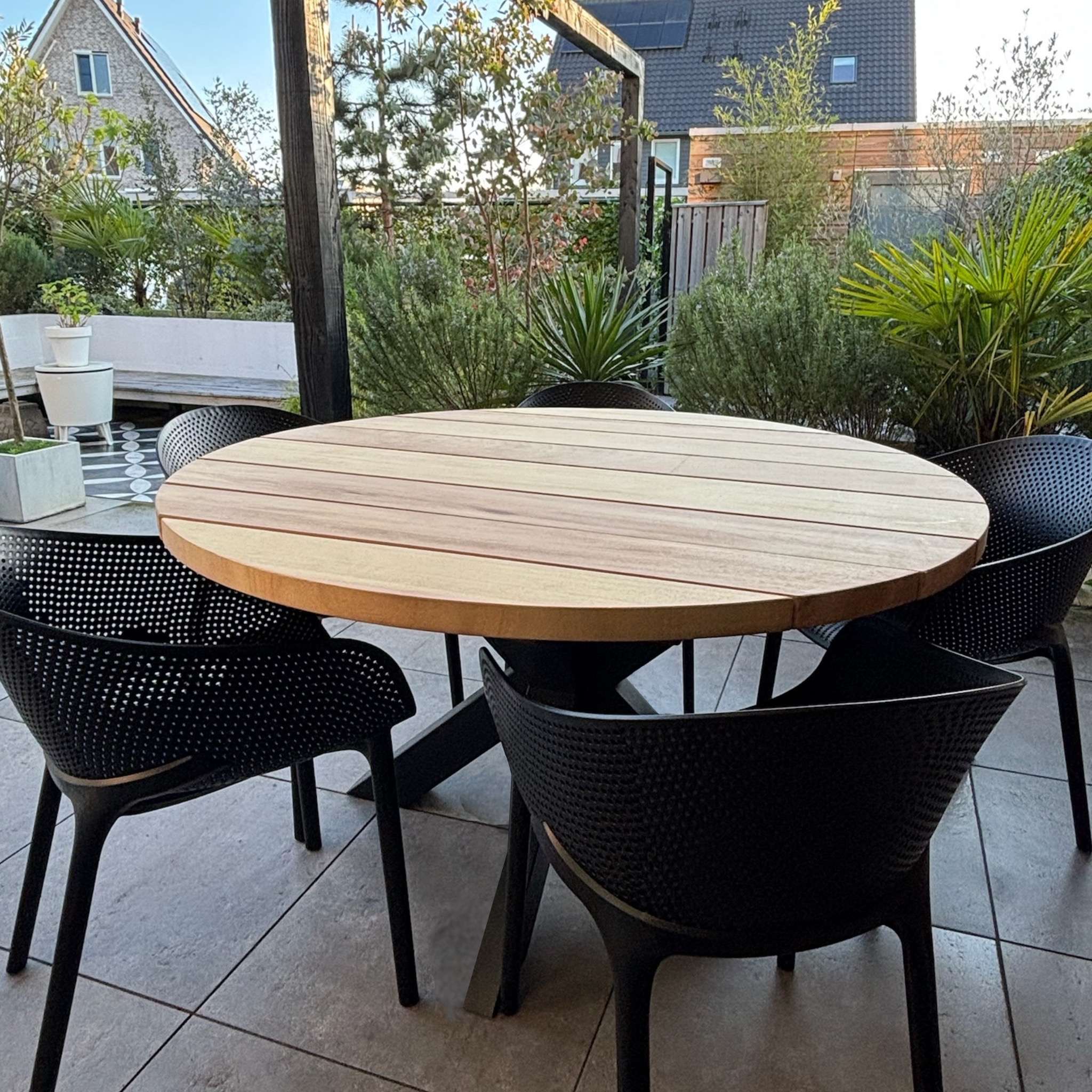 Zoek jij een Iroko tuintafel, maar ben je op zoek naar iets anders dan een rechthoekige tafel? Dan is deze ronde tuintafel met stalen poot iets voor jou! Met een ronde tafel creeër je gelijk een gezellige sfeer in jouw tuin. Daarnaast is je tuintafel duurzaam; hij gaat 10-15 jaar mee! Een ander voordeel is dat een ronde tafel minder ruimte in beslag neemt dus ideaal om jouw ruimte optimaal te benutten! Kies zelf je onderstel en afmeting, van 4 tot 6 personen. Binnen 3 weken kan jij dan genieten van een prachtige tuintafel, handgemaakt uit onze werkplaats in Hoogeveen!